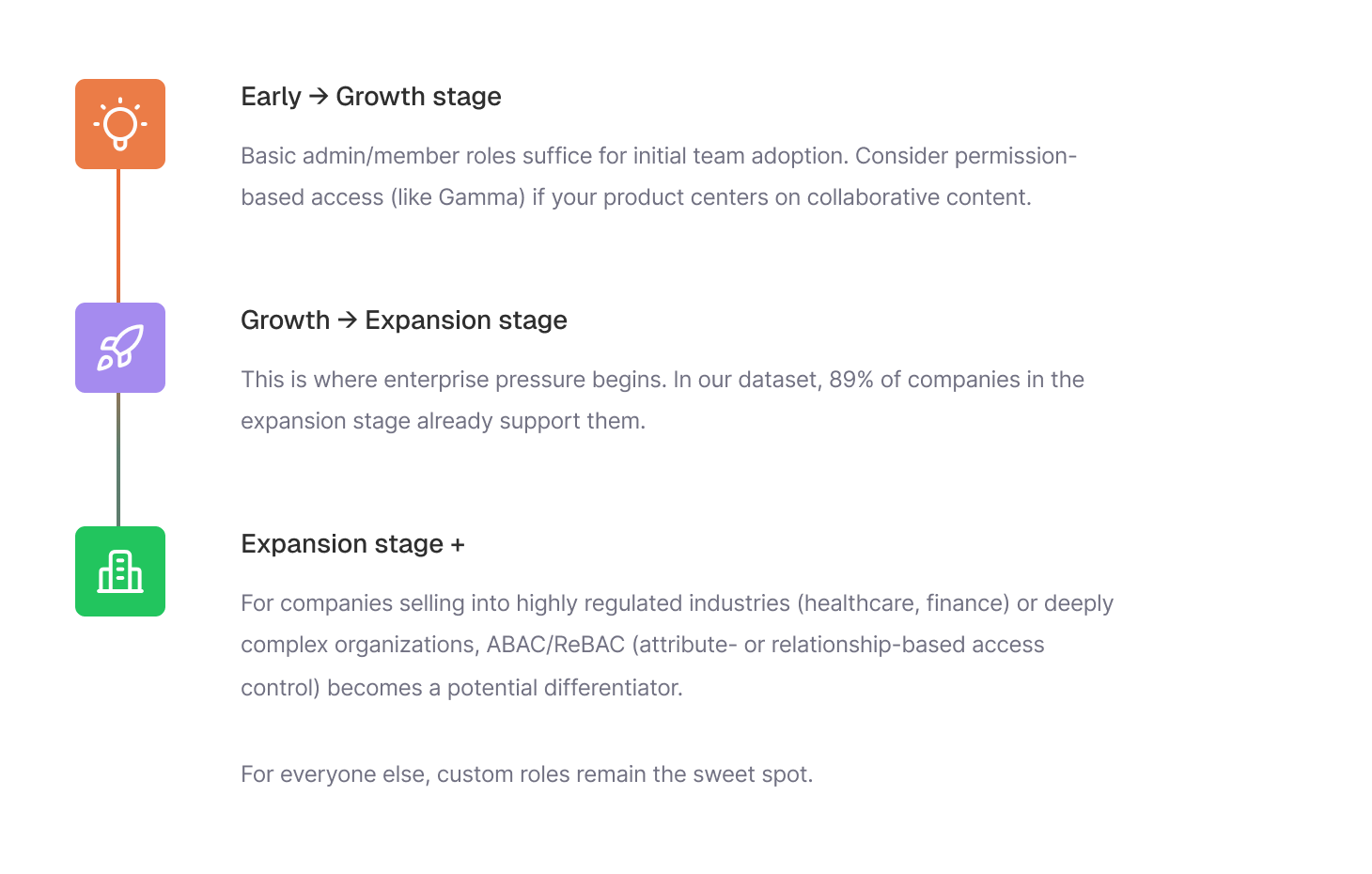 Identity evolves quickly as products grow. This breakdown shows what companies typically prioritize at each stage, from early activation to enterprise requirements.